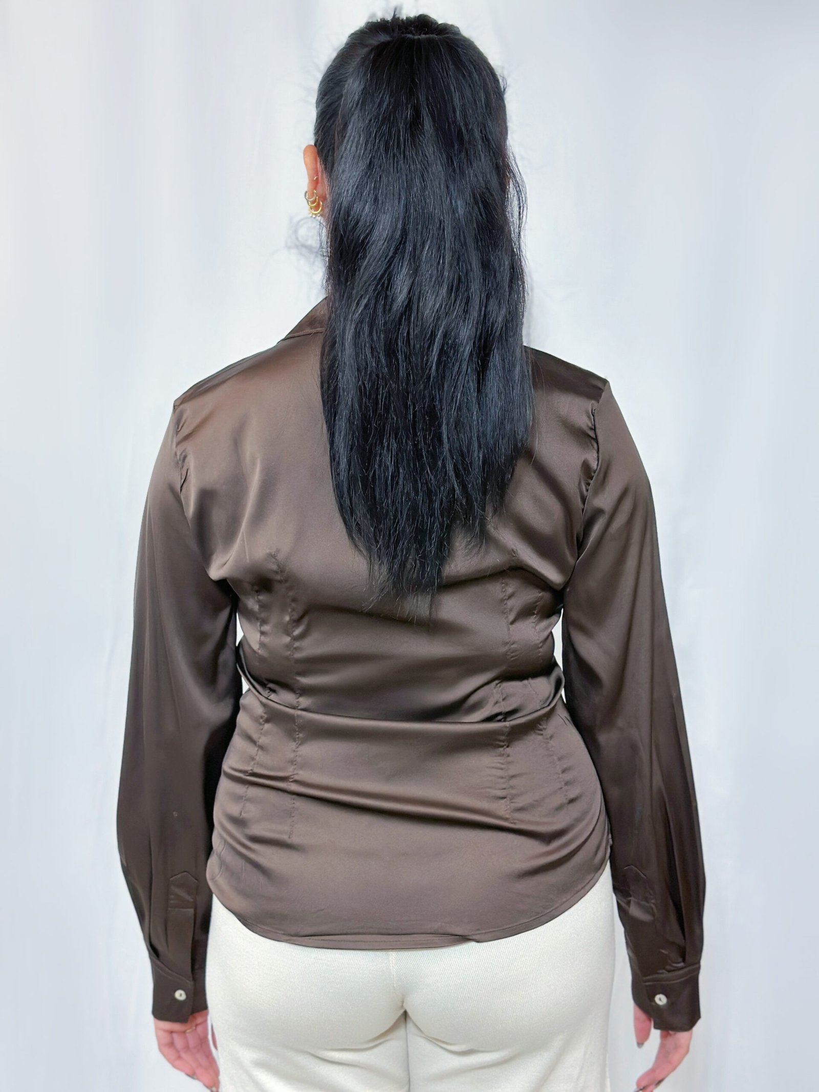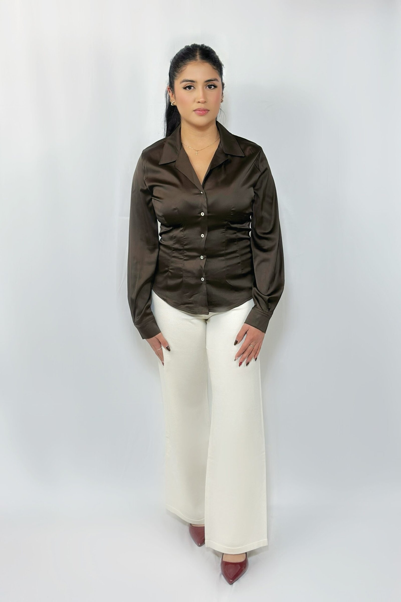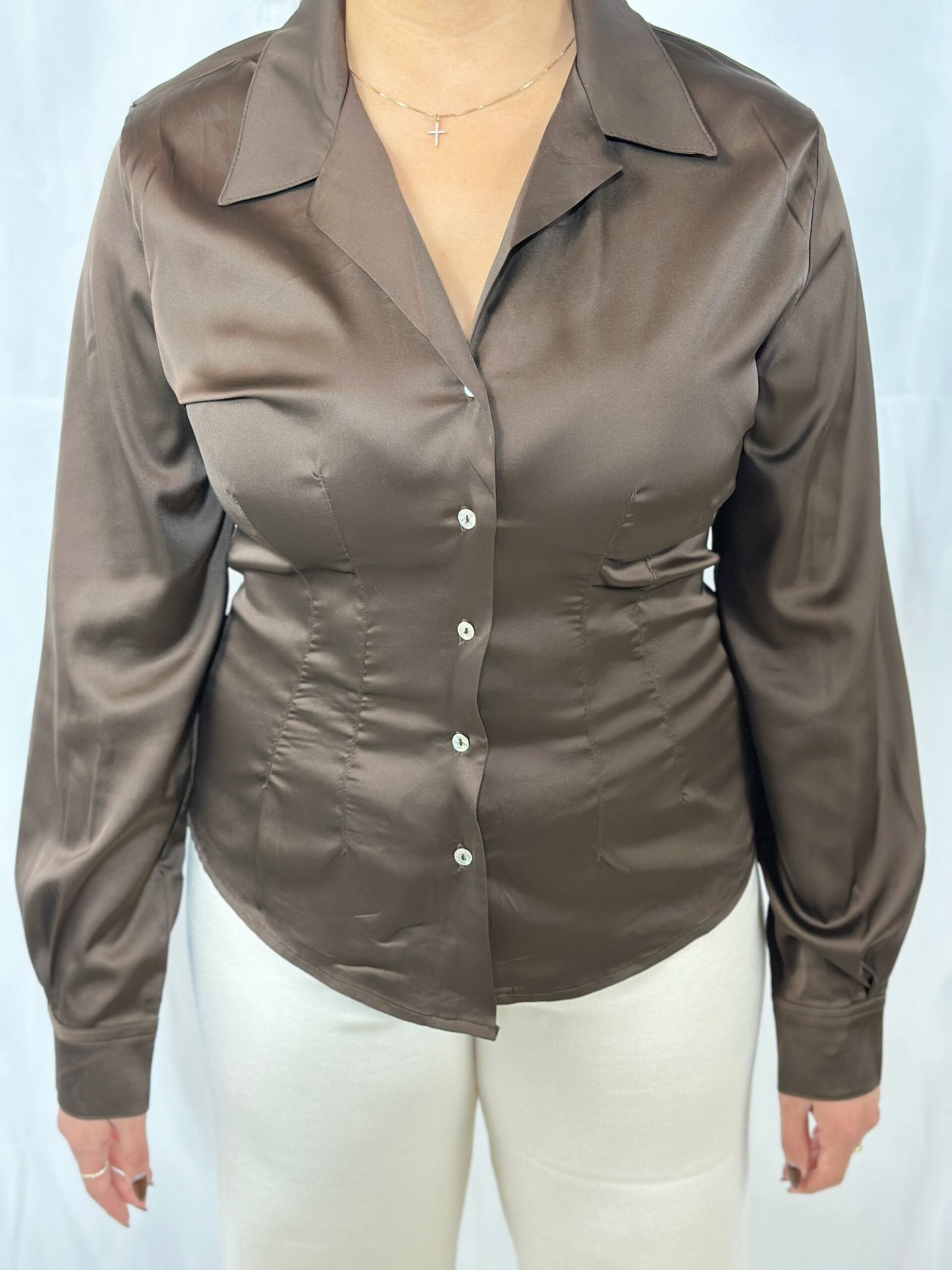 The Cinched Satin Button-Up Blouse is a true statement piece. The unique cinched waist detail highlights your curves for a figure-flattering design.